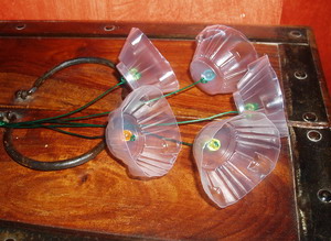 Un cop tingueu els cubilets petits, els feu un forat a la part inferior. Agafeu el filferro i talleu-ne tants trossos com flors hàgiu de fer: serviran per fer les tiges. Passeu el filferro pel forat i feu un “tope” a l’interior del cubilet (o bé doblegant el filferro per tal que no torni a sortir, o bé ajudant-vos d’una boleta de fer collarets). Doblegueu de nou el filferro per la part exterior del cubilet, així el tros de plàstic o cartró no rellisqui filferro avall.